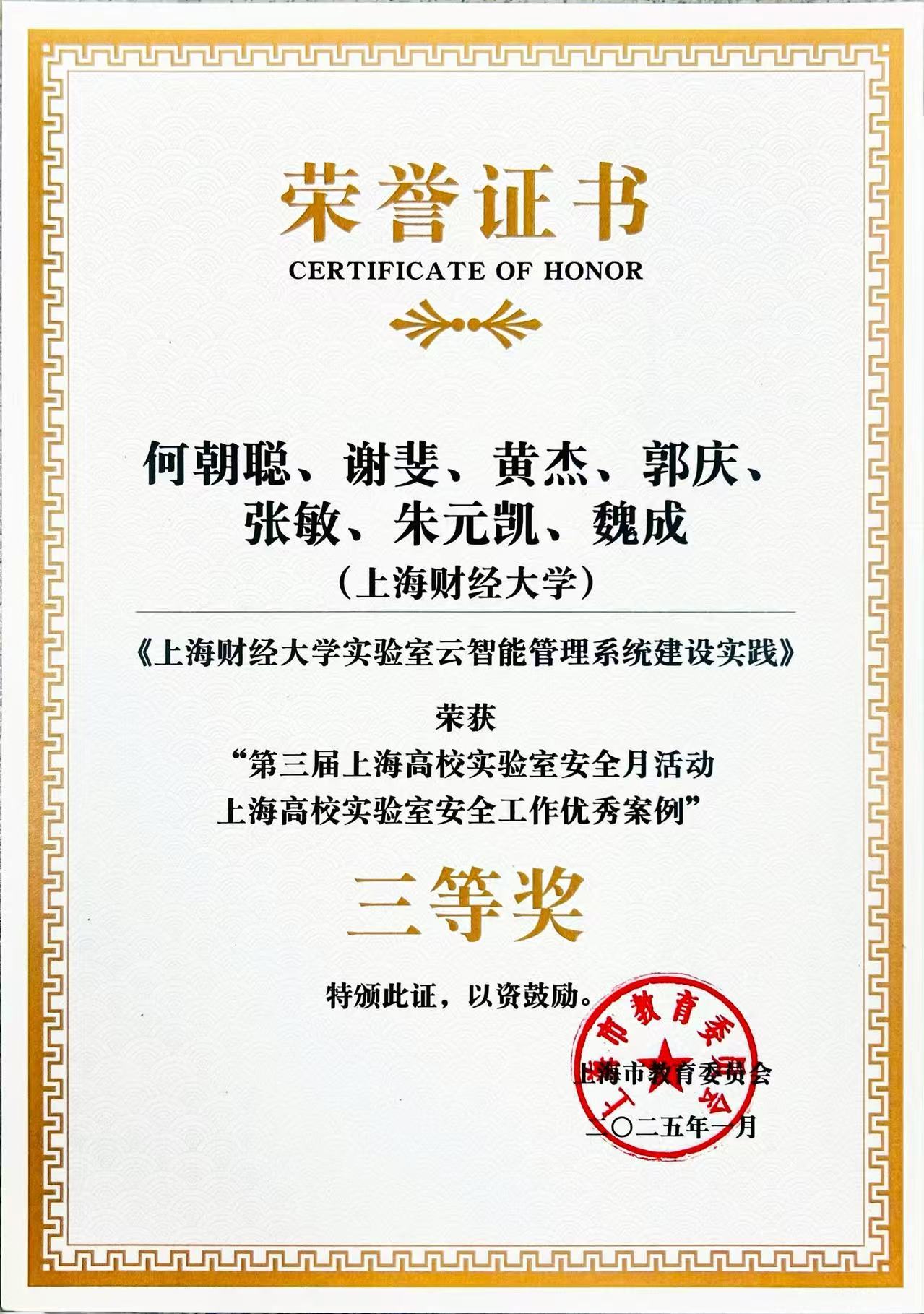 在上海市高校实验室安全工作优秀案例征集评选活动中,学校实验中心何朝聪等报送的案例《上海财经大学实验室云智能管理系统建设实践》荣获上海高校实验室安全工作优秀案例三等奖。