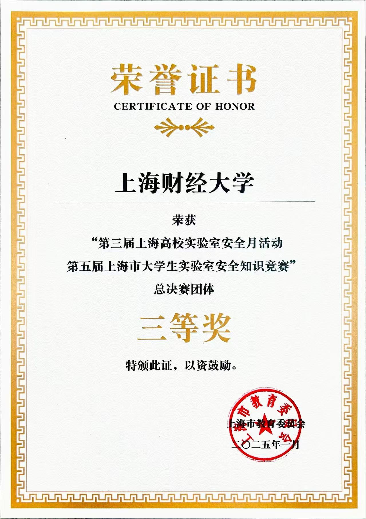 在第五届上海市大学生实验室安全知识竞赛中,来自金融学院的李相全、李东晟、杨其然同学组成的上海财经大学代表队荣获团体总决赛三等奖,展现了上财学子卓越的风采与实力。