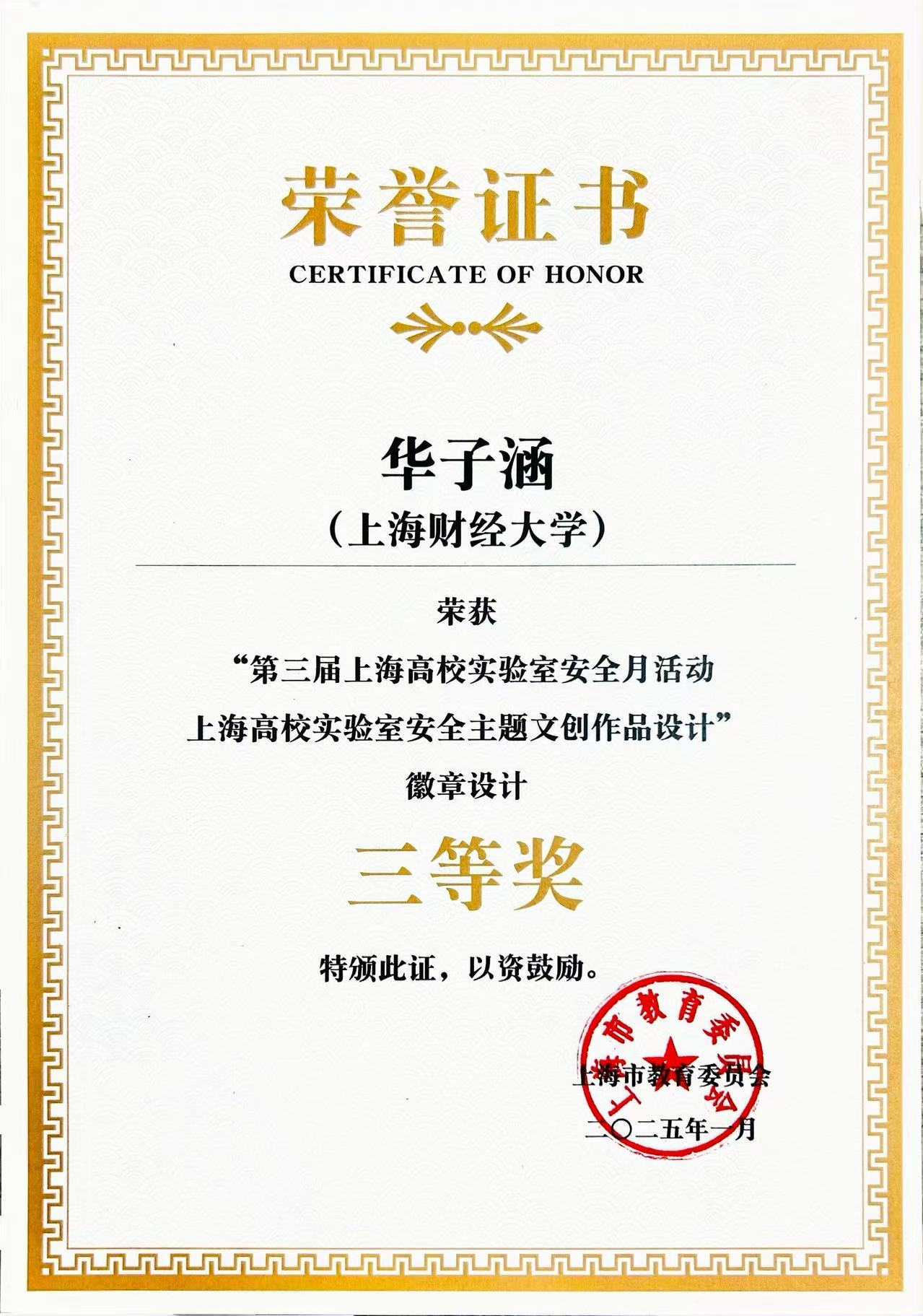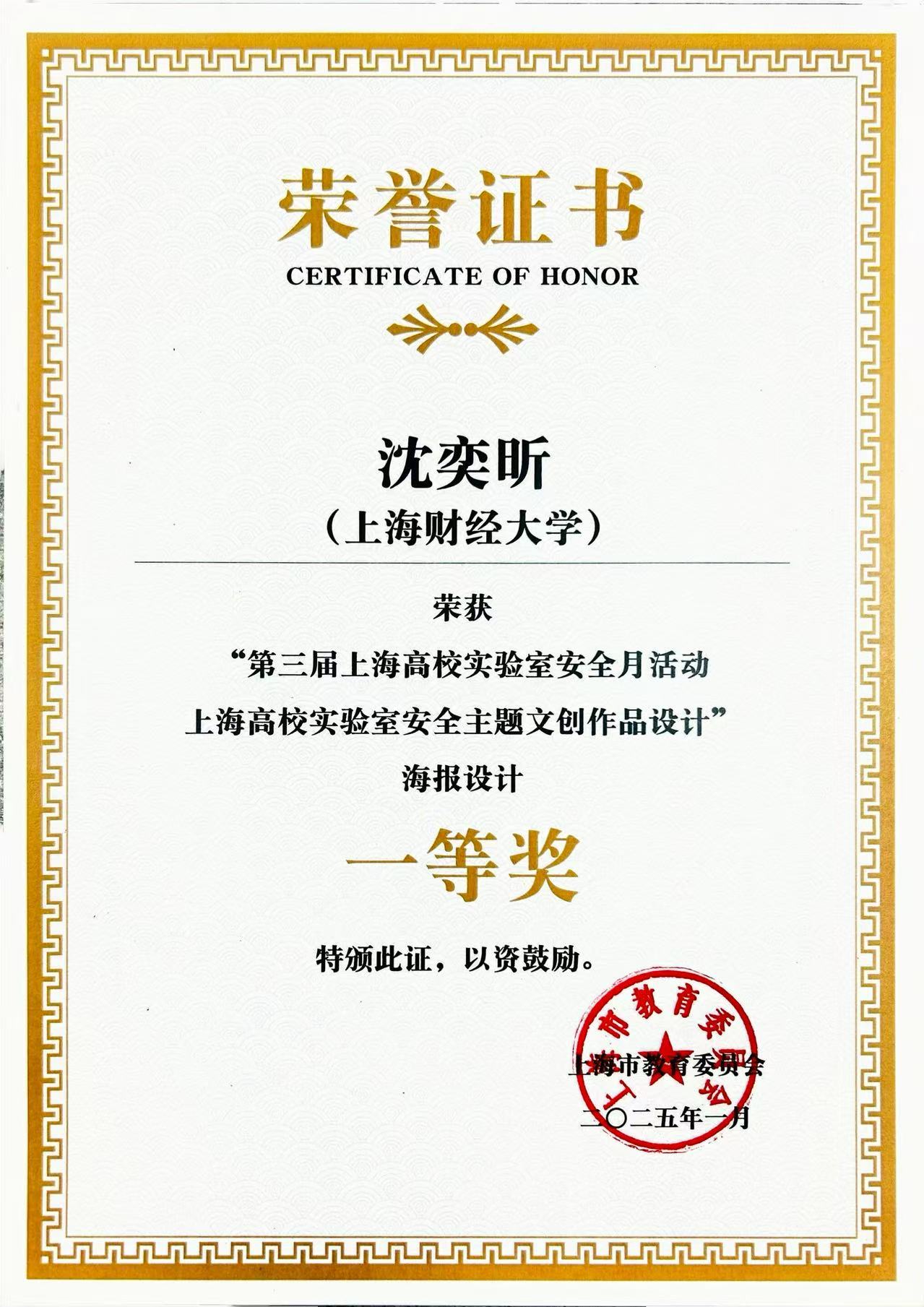 在上海市高校实验室安全主题文创作品设计征集评选活动中,人文学院沈奕昕同学的《安全不离“室”》作品荣获海报设计一等奖,金融学院华子涵同学的《安全之章》作品荣获徽章设计三等奖。